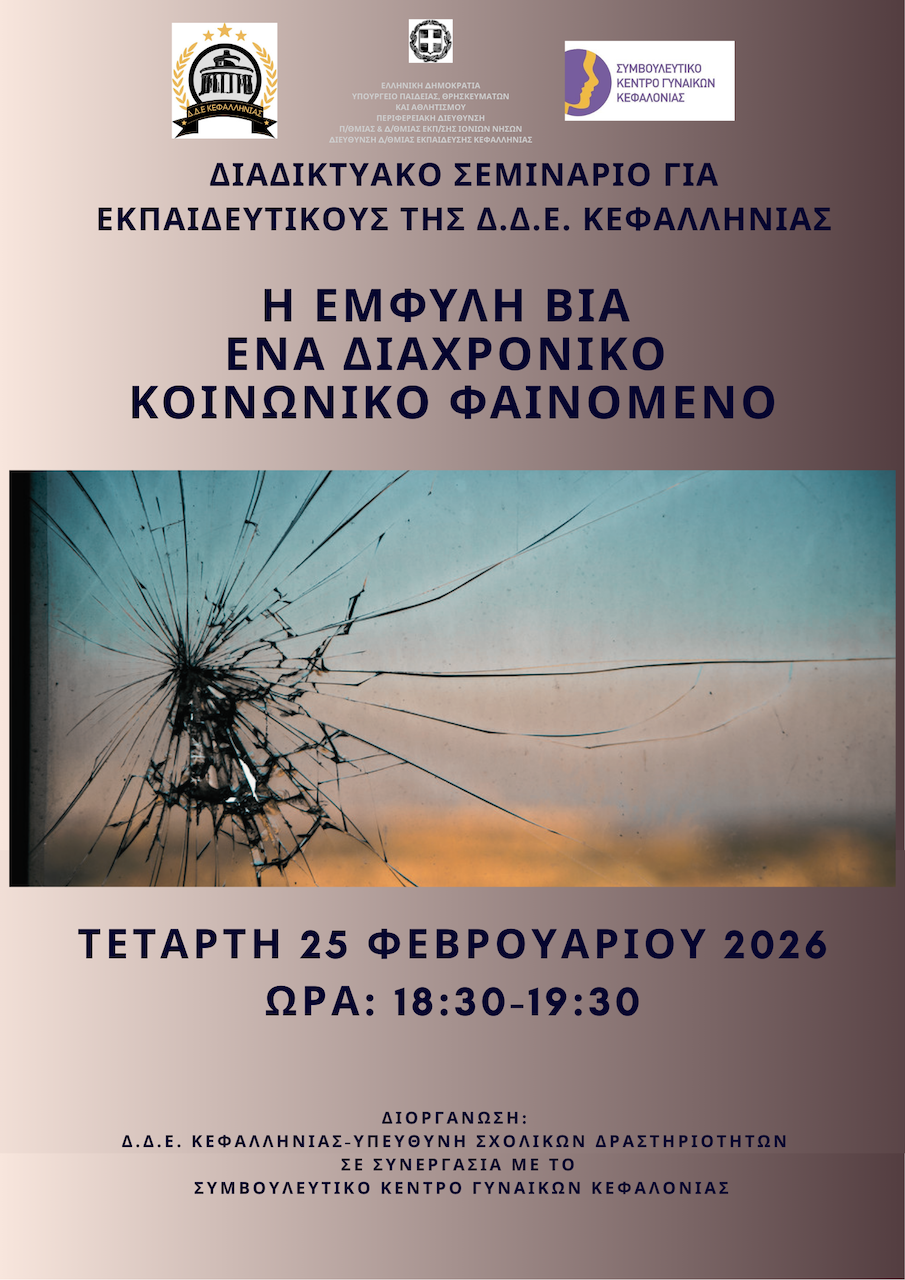Η Διεύθυνση Δευτεροβάθμιας Εκπαίδευσης Κεφαλληνίας δια της Υπεύθυνης Σχολικών Δραστηριοτήτων σε συνεργασία με το Συμβουλευτικό Κέντρο Γυναικών Κεφαλονιάς διοργάνωσαν με επιτυχία το διαδικτυακό σεμινάριο για εκπαιδευτικούς της Δ.Δ.Ε. Κεφαλληνίας, με θέμα: