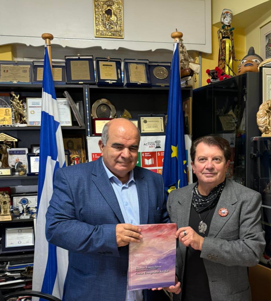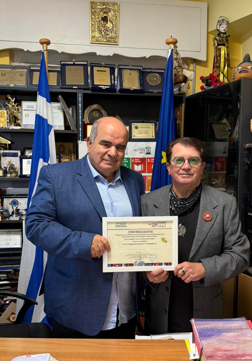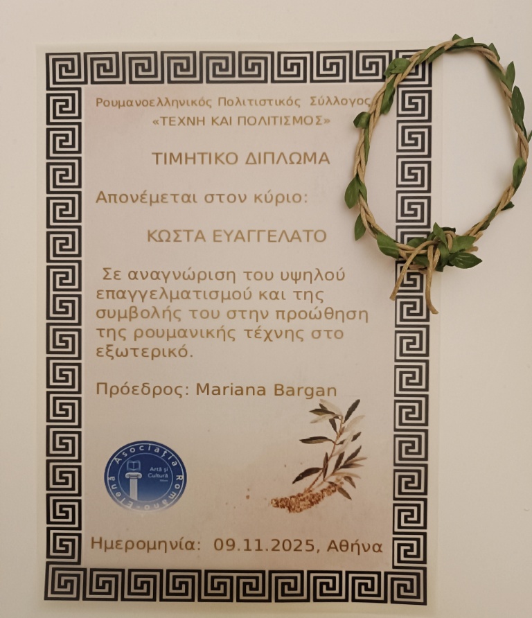 Του απονεμήθηκε επίσης τιμητικό δίπλωμα και συμβολικό στεφάνι ελιάς από την κ. Marianna Barkan, Πρόεδρο του Ρουμανοελληνικού  Πολιτιστικού Συλλόγου «Τέχνη και Πολιτισμός», μετά  την θεωρητική, κριτική του προσέγγιση στα εγκαίνια της έκθεσης του Ρουμάνου καλλιτέχνη Petre Grigorin , με τίτλο «Μεταμόρφωση».  Η έκθεση του διακριμένου ζωγράφου πραγματοποιήθηκε με επιτυχία στον Ελληνογαλλικό Σύνδεσμο Αθηνών.