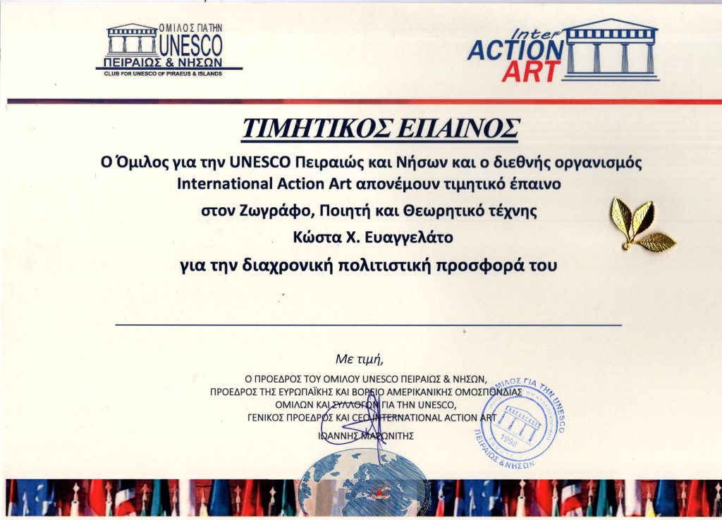 Παρέλαβε, την ημέρα των γενεθλίων του, τιμητικό έπαινο για το σύνολο της καλλιτεχνικής του προσφοράς από τον κ. Ιωάννη Μαρωνίτη, πρόεδρο των Ομίλων για την Unesco της Ευρώπης και της Βόρειας Αμερικής και πρόεδρο της International Action Art, του Ομίλου για την Unesco Πειραιώς και Νήσων. Στην απονομή που έγινε στα γραφεία της Unesco στην Νίκαια, ο τιμώμενος  ευχαρίστησε για την αιγίδα της Unesco  στη θερινή, επετειακή έκθεση του στη Σύγχρονη Πινακοθήκη Villa Ροδόπη στο Αργοστόλι, και την αγαστή διαχρονική συνεργασία τους σε διεθνείς εικαστικές εκθέσεις, εκδηλώσεις και βραβεύσεις, και κύρια για την συμμετοχή του με ζωγραφικά έργα του στο κεντρικό κτίριο της Unesco στο Παρίσι.