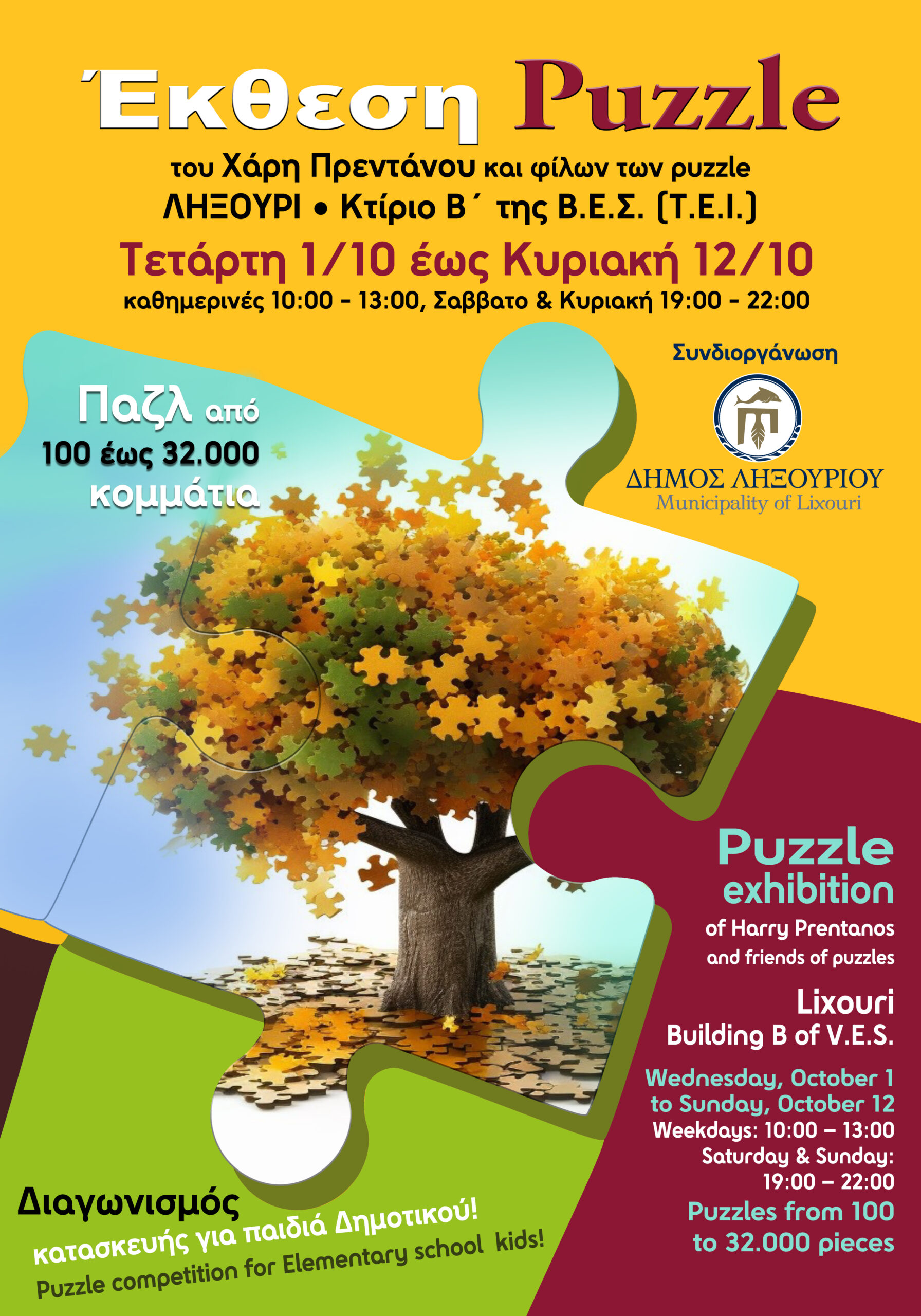 Ο Δήμος Ληξουρίου και ο Χάρης Πρεντάνος σας προσκαλούν στην έκθεση παζλ που θα φιλοξενηθεί στο Κτίριο Β’ της Βαλλιανείου Επαγγελματικής Σχολής, από την Τετάρτη 1 Οκτωβρίου έως και την Κυριακή 12 Οκτωβρίου 2025.
