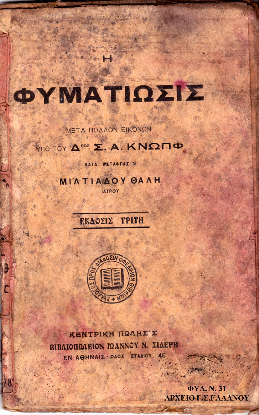 1. « Η Φυματίωσις μετά πολλών εικόνων υπό του Δρος Σ. Α. Κνωπφ κατά μετάφραση Μιλτιάδου Θαλή, έκδοση του Συλλόγου προς διάδοσιν Ωφελίμων βιβλίων, 1927…». Στο φυλλάδιο αυτό υπάρχουν πολλά κεφάλαια επεξηγηματικά για το λαό με πρώτο τη Φυματίωση ως: «Εξεταζόμενη ως νόσος του λαού», καθώς και ιστορικά γι’ αυτήν που ξεκινούν από τον πρώτον στην αναφορά, τον μεγάλο ιατρό της αρχαιότητας, τον  Ιπποκράτη. Στα ενδιαφέροντα κεφάλαια που υπάρχουν για την αντιμετώπιση της φθίσης είναι και το: «Συνεχής αεροθεραπεία».