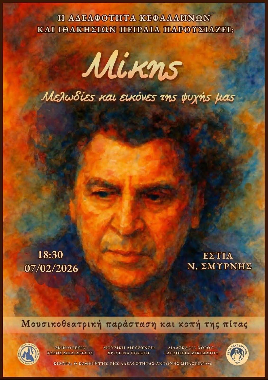Η Αδελφότητα Κεφαλλήνων και Ιθακησίων Πειραιά σας προσκαλεί με ιδιαίτερη χαρά στη μουσικοθεατρική παράσταση «Μίκης – Μελωδίες και εικόνες της ψυχής μας», ένα αφιέρωμα στον σπουδαίο Μίκη Θεοδωράκη, μέσα από μουσική, λόγο και κίνηση.