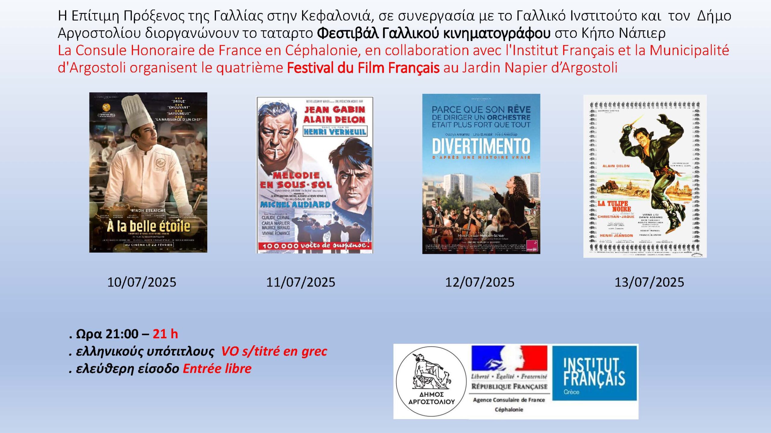 Στο πλαίσιο των εκδηλώσεων Πολιτιστικό Καλοκαίρι 2025, ο Δήμος Αργοστολίου σε συνεργασία με το Γαλλικό Ινστιτούτο Ελλάδος και την επίτιμη Πρόξενο της Γαλλίας στην Κεφαλονιά, θα παρουσιάσουν αφιέρωμα στον παλιό & τον σύγχρονο Γαλλικό Κινηματογράφο, στον Κήπο ΝΑΠΙΕΡ από την Πέμπτη 10/7 έως την Κυριακή 13/7, κάθε βράδυ στις 9 μμ, προβάλλοντας με ΕΛΕΥΘΕΡΗ ΕΙΣΟΔΟ τις παρακάτω ταινίες :