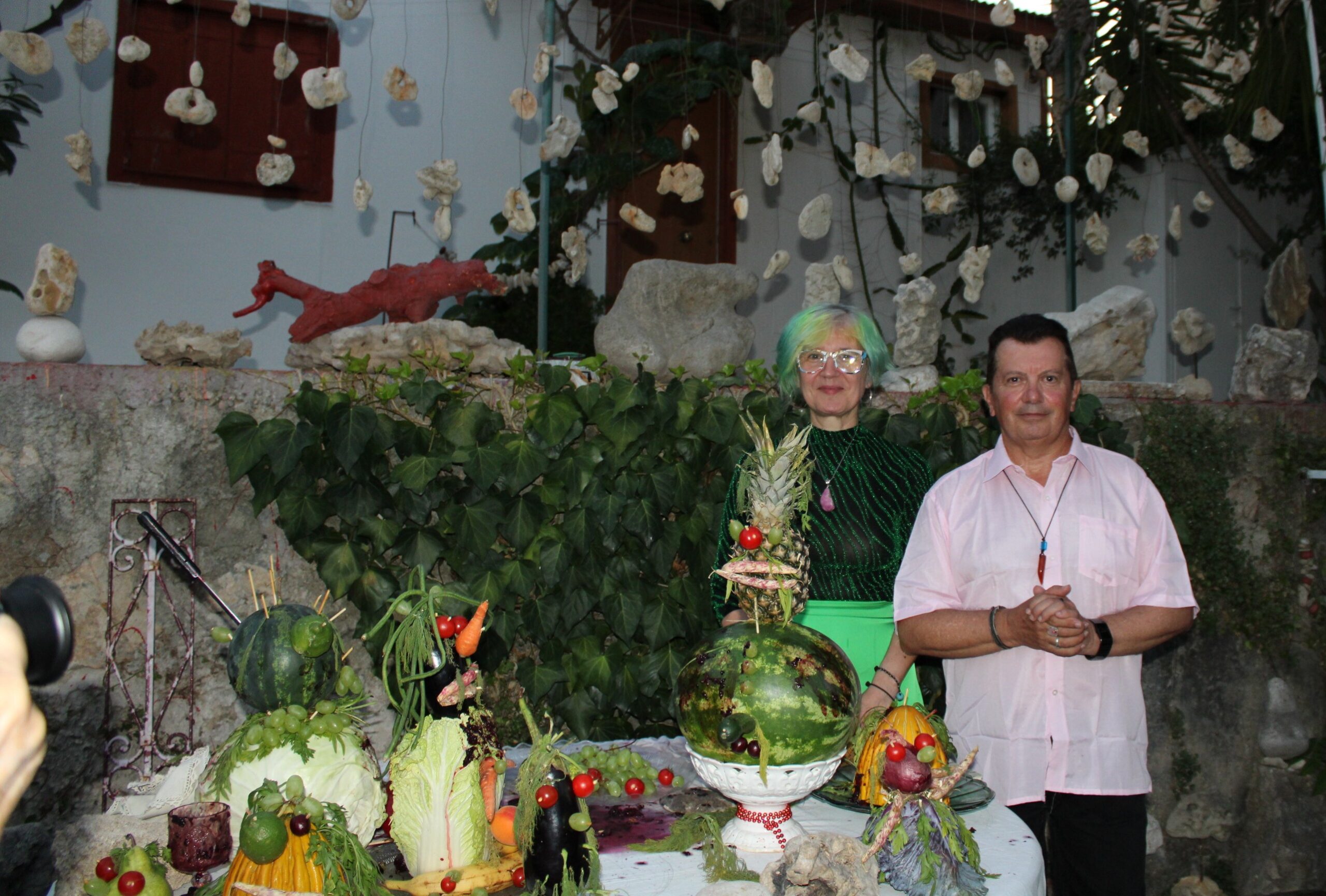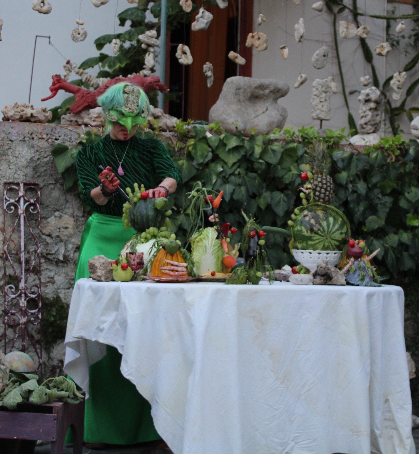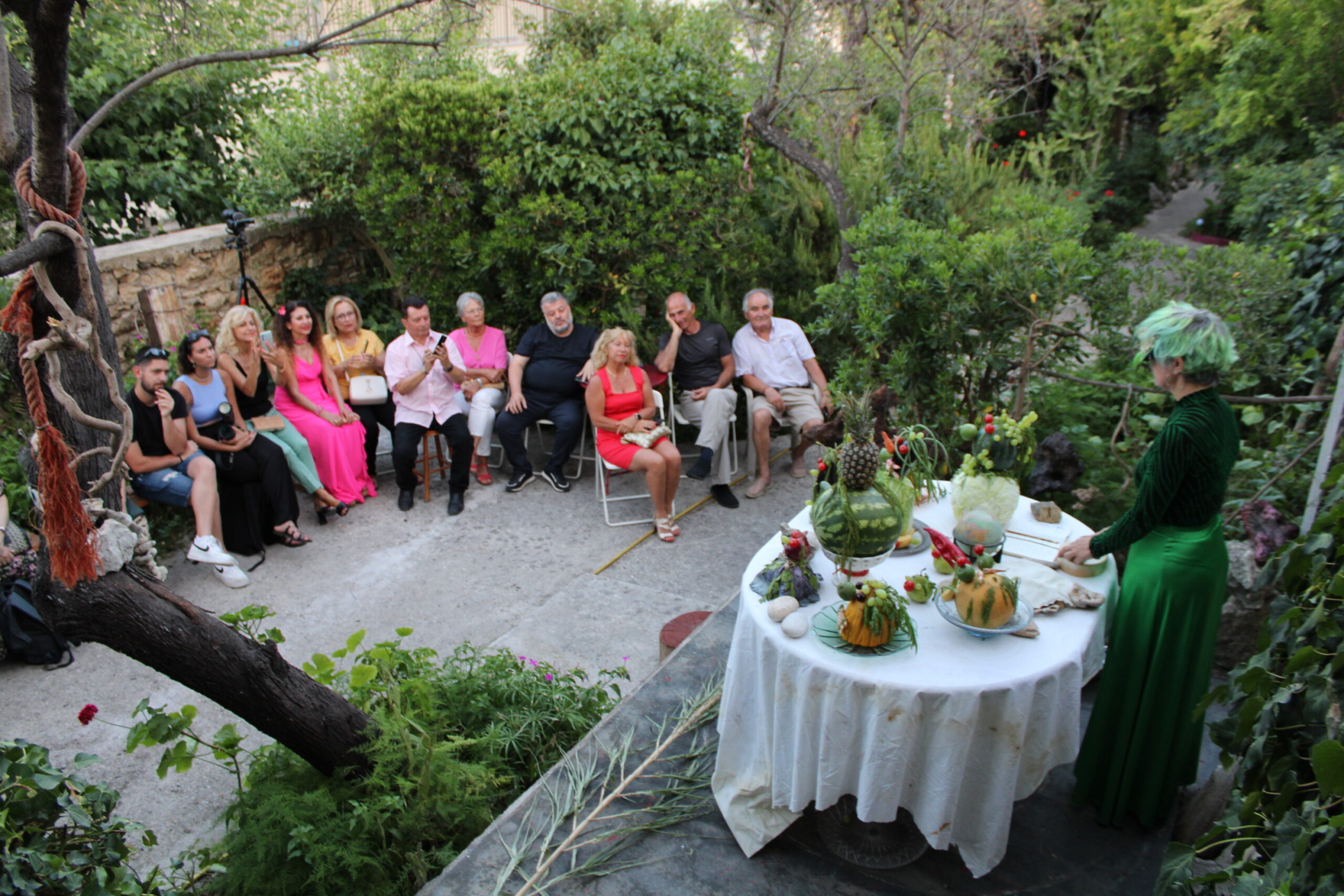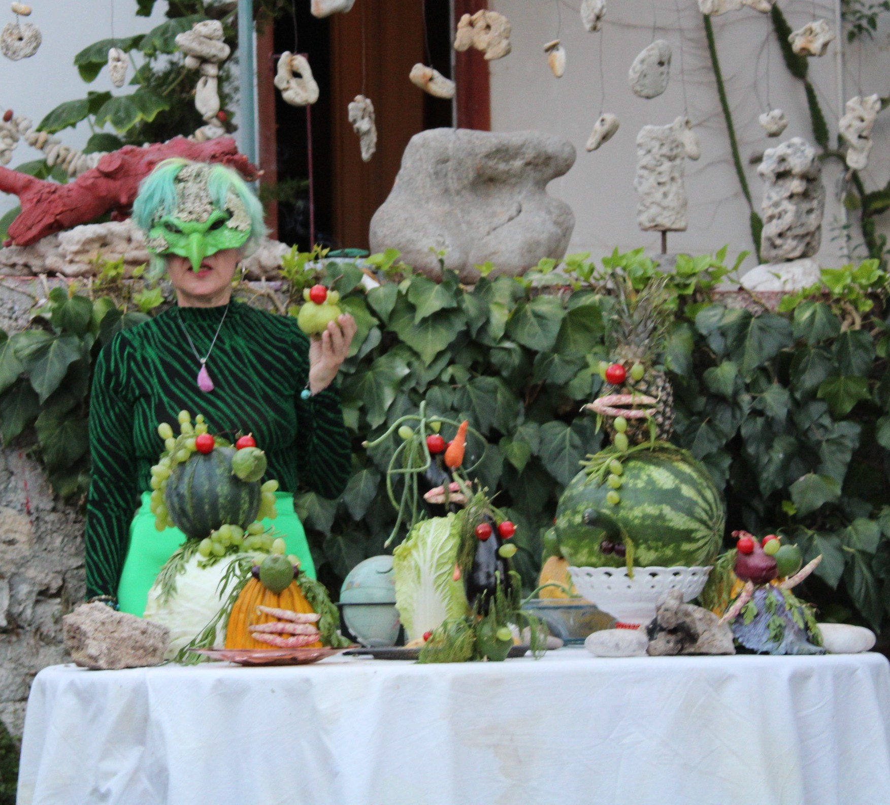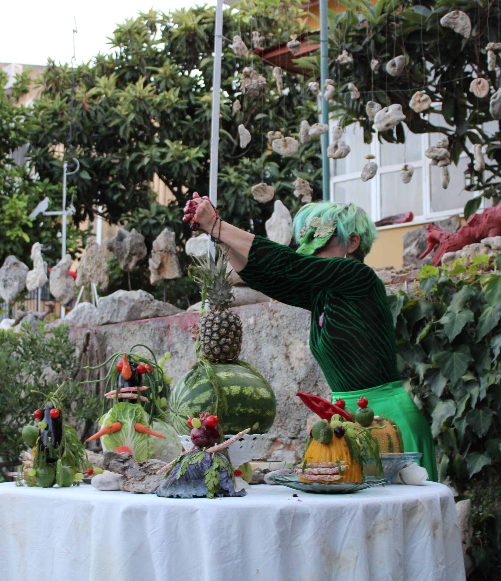 Η ζωντανή εικαστική παράσταση της Πασκάλ Γουέμπερ, με τον ποιητικό τίτλο ” Cannibal Ritual, Καννιβαλική τελετουργία” πραγματοποιήθηκε στη “Μώβ Σκηνή” του “Κήπου του Χαρίλαου” της Πινακοθήκης Villa Ροδόπη εντυπωσιάζοντας τους παρόντες και συμμετέχοντες. Η πρωτοποριακή καλλιτέχνης, η οποία ήρθε από το Παρίσι, μέλος της ομάδας Hantu και καθηγήτρια στην Ecole des Arts του Πανεπιστημίου της Σορβόνης επικεντρώθηκε στη σχέση μας με τον φυτικό κόσμο, ιδιαίτερα στο πλαίσιο των τελετών. Η προσέγγισή της βασίστηκε ευφάνταστα στην πολιτισμική ανθρωπολογία και τη μυθοπλασία. Χρησιμοποιώντας βιωματικές και υποσυνείδητες αφηγήσεις, σύνδεσε πρακτικές από διαφορετικές εποχές και τόπους με λαϊκούς και ιερούς πολιτισμούς. Για την ίδια, ο καλλιτέχνης έχει μια πολύ ισχυρή σχέση με την παράδοση, την οποία υπερασπίζεται και καταγγέλλει προκειμένου να την ανανεώσει. Ο καλλιτέχνης είναι αυτός που τρέφει τη συλλογική φαντασία και σχεδιάζει συμβολικά εργαλεία, ώστε να μπορούμε να φανταστούμε έναν μεταβαλλόμενο κόσμο. Η Performance της ακολούθησε το τελετουργικό σχεδιάγραμμα: Τραπέζι φορτωμένο με λουλούδια, φρούτα και φρέσκα λαχανικά σε ακανόνιστα σχήματα. Σιωπηλή περισυλλογή. Συναρμολόγηση φυτικών αγαλμάτων. Ορισμένα άσεμνα, άλλα πολεμοχαρή, άλλα επιβλητικά και προστατευτικά. Στη συνέχεια άρχισε να τεμαχίζει τα χορτοφαγικά τοτέμ για το συμπόσιο. Στη συνέχεια, αφαίρεσε προσεκτικά τους σπόρους, επικαλούμενη τους θεούς της αγροτικής γονιμότητας, αναφερόμενη στις χώρες καταγωγής των προιόντων, που έχουν φθάσει και σε μας, όπως και οι πρόσφυγες, από τα πέρατα του κόσμου.