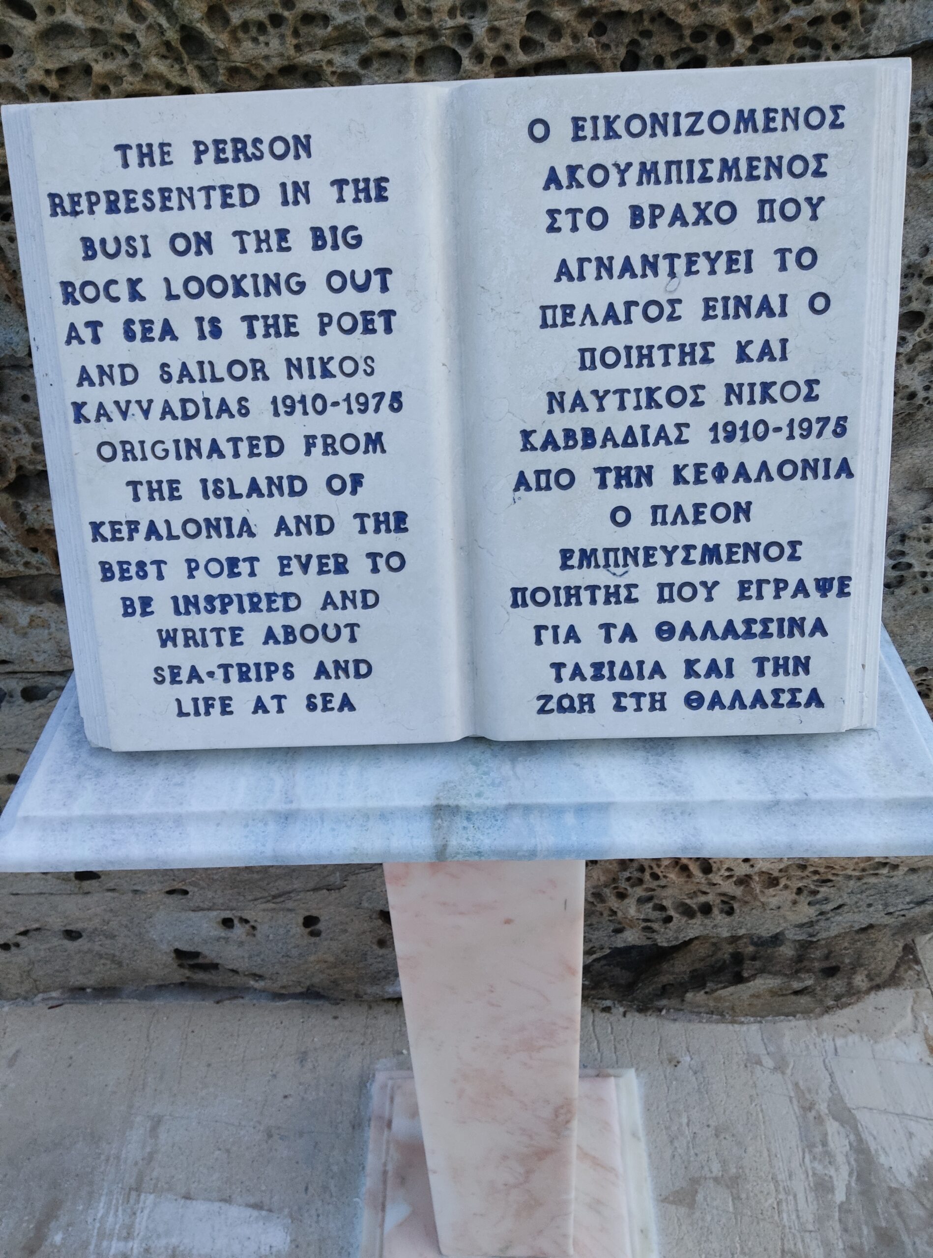 Μαρμάρινη πλάκα, μετά την σύμφωνη γνώμη του Δημάρχου Αργοστολίου κ Θεόφιλου Μιχαλάτου και του Συλλόγου Ναυτικών ΝΙΚΟΣ ΚΑΒΒΑΔΙΑΣ ο οποίος έχει την φροντίδα και επιμέλεια του χώρου, κοσμεί την προτομή και ενημερώνει στα Ελληνικά και στα Αγγλικά τους επισκέπτες του νησιού μας για τον ποιητή της θάλασσας.