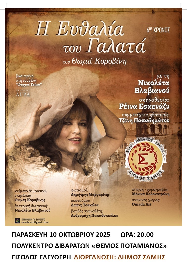 Ο Δήμος Σάμης σας ενημερώνει ότι σήμερα Παρασκευή 10 Οκτωβρίου 2025 και ώρα 20.00 θα παρουσιάσει στο Πολύκεντρο Διβαράτων «Θέμος Ποταμιάνος» την επιτυχημένη παράσταση «Η Ευθαλία του Γαλατά». Ένας συγκλονιστικός μονόλογος βασισμένος σε αληθινή ιστορία. Είσοδος ελεύθερη.