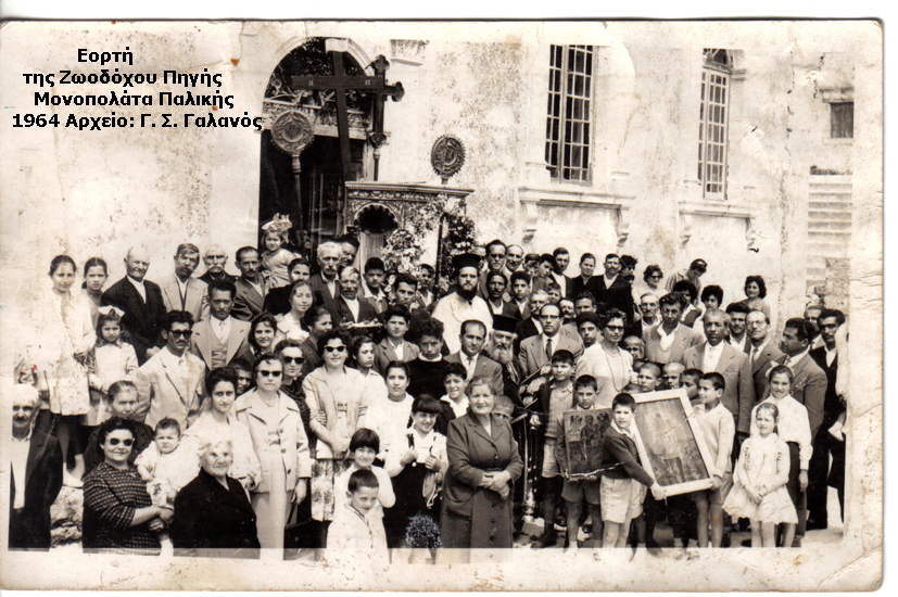 Στα Μονοπολάτα στο ναό της Αγίας Παρασκευής εορτάζει μεγαλόπρεπα η Ζωοδόχος Πηγή και μάλιστα ο παλιός δάσκαλος, Μαρίνος Αναστασίου Ευαγγελάτος γεννημένος το 1878, έγραψε δύο ύμνους για την εορταστική ημέρα του χωριού του. Ψάλλονται δε με πολλή κατάνυξη την ημέρα της πανηγύρεως.
