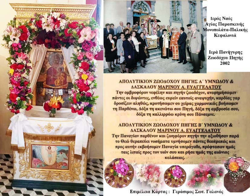 Πηγές: Από εκκλησιαστικά βιβλία που αναφέρονται στις εορτές του χριστιανισμού και στοιχεία από παλιά δημοσίευση μου  για το Πανηγύρι στα Αργίνια, το 2011, εικόνες από τη Ζωοδόχο Πηγή Σάμης και άλλες εκκλησίες του νησιού. Επίσης, στοιχεία από το φάκελο « Εκπαίδευση στην Κεφαλληνία- δάσκαλοι – εκπαιδευτικοί.»
