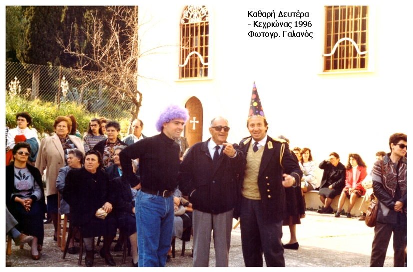 Έτσι, οι παλιές μασκαρίες του νησιού στα χωριά είχαν για πρωταγωνιστές, τον κουδουνά, τον Τσάφο, τις Μπούλες, τον Μπουλούμπαση, τον Αστυνομικό, τον Φρουρό και άλλους τύπους, που μέσα στο εθιμικό της Αποκριάς κρατούσαν το κέφι με ένα τρόπο κοινωνικό, χαρούμενο και διασκεδαστικό, πάνω από όλα αλληλένδετα θεματικό στην τελετουργία του. Δεν έλειπε η Ελληνική σημαία, που καθώς το σώμα των μασκαρεμένων πήγαινε από γειτονιά σε γειτονιά να δώσει την παράστασή του, μπροστά κάποιος κρατούσε την Ελληνική Σημαία και την ύψωνε με το κοντάρι της σε σημείο που να δεσπόζει και να θυμίζει…ελληνικότητα