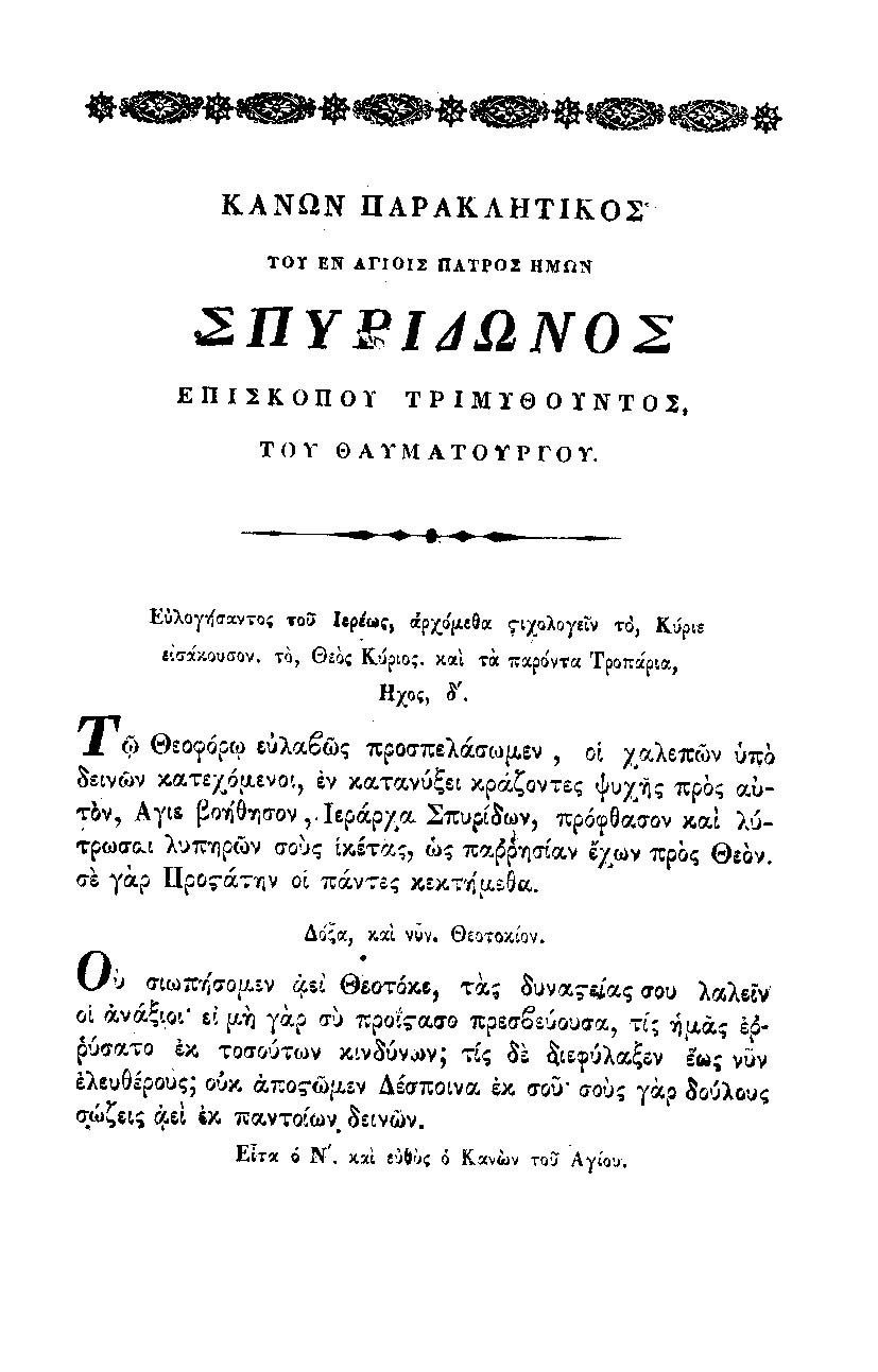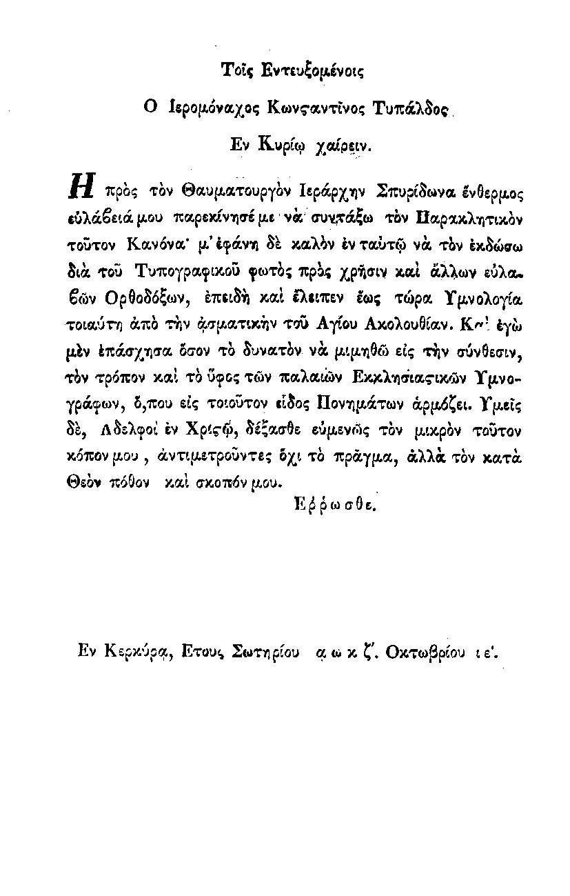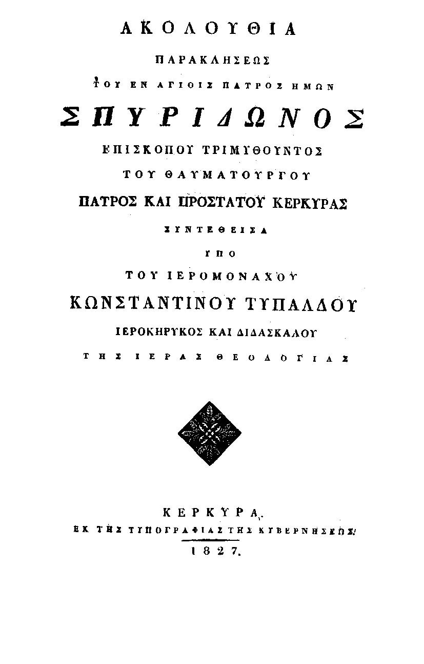 Η παρακλητική υμνογραφία προς τον Άγιο Σπυρίδωνα, συνταχθείσα από τον σπουδαίο Ληξουριώτη λόγιο ιερωμένον, Κωνσταντίνον Τυπάλδον Ιακωβάτον
