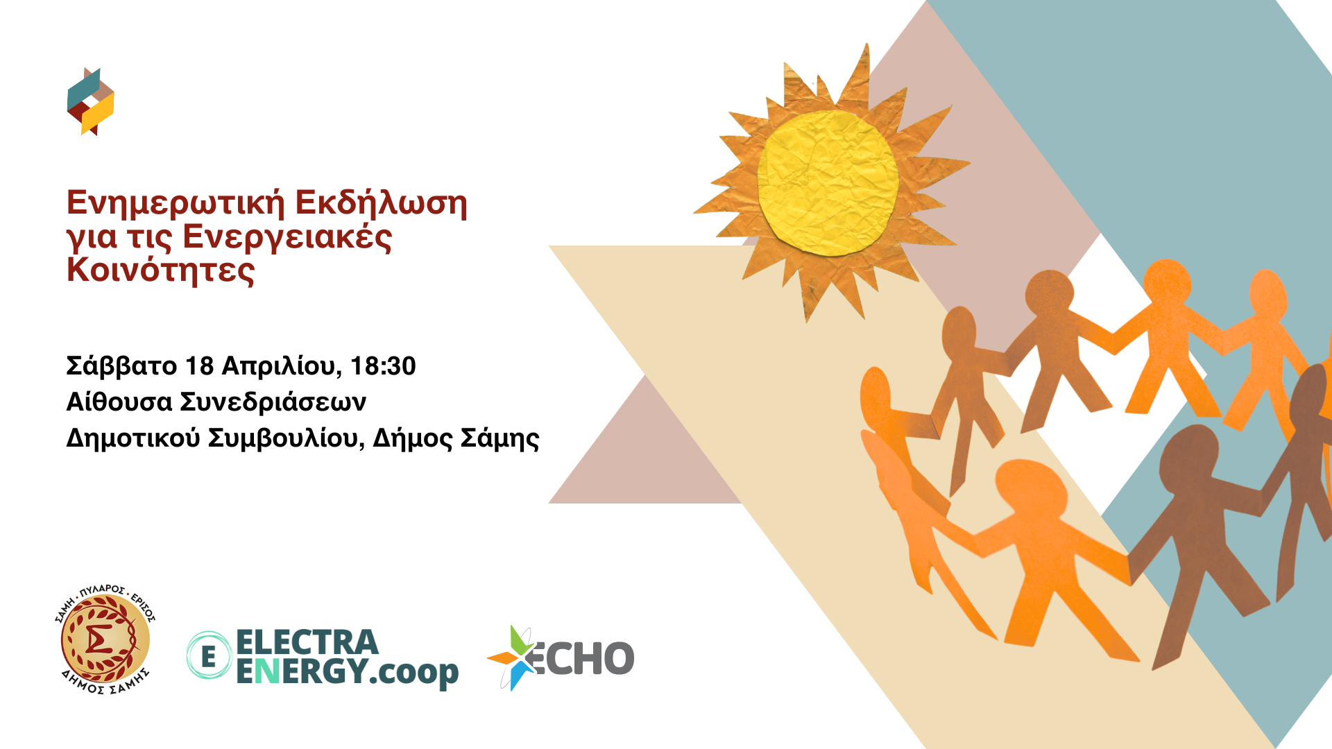 Η Σάμη κάνει το πρώτο βήμα στην κοινοτική ενέργεια! Ο Δήμος Σάμης σας προσκαλεί στην πρώτη ανοιχτή ενημερωτική εκδήλωση για τις Ενεργειακές Κοινότητες που θα πραγματοποιηθεί το Σάββατο, 18 Απριλίου και ώρα 18:30, στην Αίθουσα Συνεδριάσεων του Δημοτικού Συμβουλίου Δήμου Σάμης.