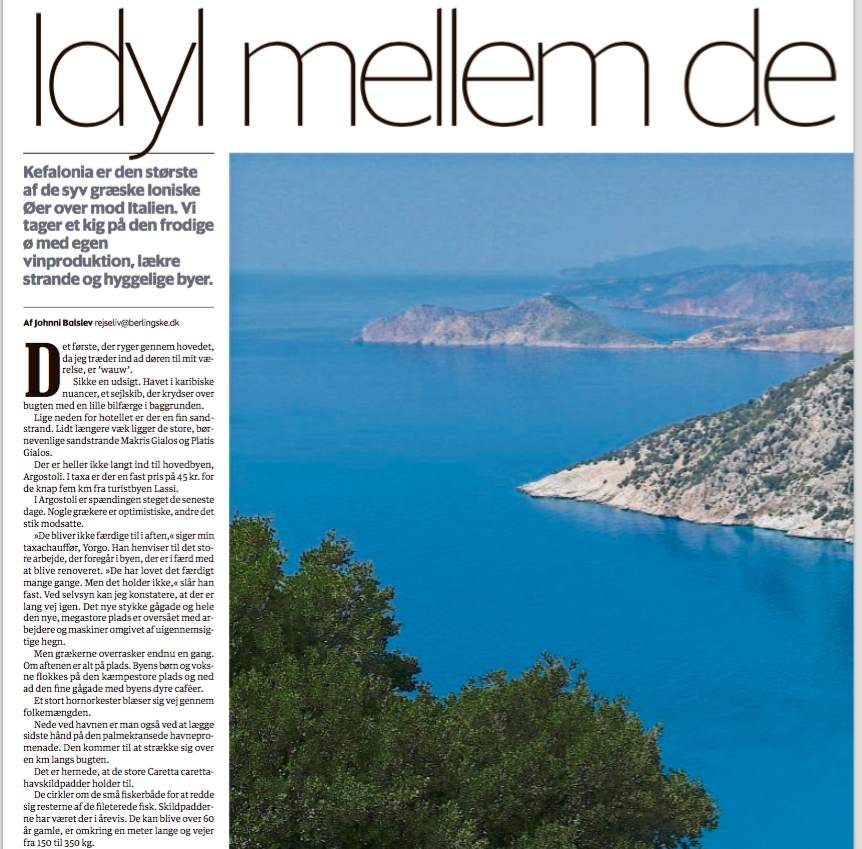 Ιδιαίτερες ευχαριστίες ανήκουν στην κ. Σαραντίδη, η οποία μέσω του διακεκριμένου δημοσιογράφου στη Δανία κ. Johni Baslev συνέβαλε στη δημοσίευση δύο εξαιρετικών άρθρων ταξιδιωτικής προβολής της Κεφαλονιάς στην εφημερίδα Berlingske, που θεωρείται από τις μεγαλύτερες εφημερίδες της Δανίας.