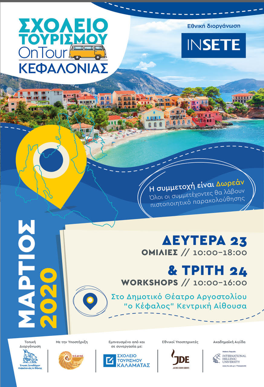 Σε συνέχεια της περσινής επιτυχημένης διοργάνωσης του πρώτου Σχολείου Τουρισμού OnTour ΚΕΦΑΛΟΝΙΑΣ με περισσότερους από 400 συμμετέχοντες, 15 εθελοντές, πληθώρα θεματολογιών και 8 εξειδικευμένους ομιλητές του τουριστικού τομέα, ανανεώνεται το ραντεβού για 2η συνεχόμενη χρονιά. Το 2ο Σχολείο Τουρισμού OnTour ΚΕΦΑΛΟΝΙΑΣ, έρχεται στις 23 Μαρτίου ημέρα ομιλιών και 24 Μαρτίου ημέρα εργαστηρίων στο Δημοτικό Θέατρο, “O Κέφαλος”, με νέες ιδέες και θεματολογίες και απευθύνεται σε όσους άμεσα ή έμμεσα, απασχολούνται και επηρεάζουν το τουριστικό προϊόν και τις υπηρεσίες της ευρύτερης περιοχής της Κεφαλονιάς και της Ιθάκης.