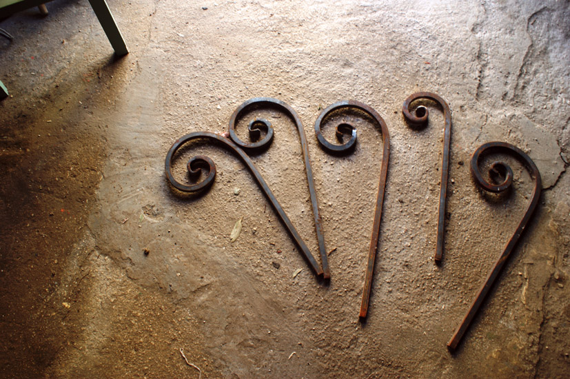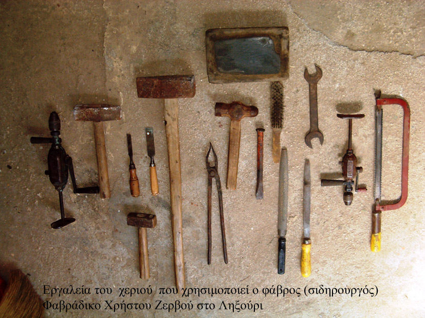 Στρώσαμε σε σειρές τα εργαλεία του σιδηρουργού, για τις ανάγκες της φωτογράφησης. Για το καθένα ο Χρήστος Ζερβός μιλούσε με τέτοια οικειότητα, που διαπίστωνε κανείς πως είχε μια «ερωτική σχέση» και πάθος με αυτήν τη βιοποριστική τέχνη του. Λίμες στρογγυλές, λίμες Matsou, λίμες για σίδερα, σιδεροπρίονα, ψαλίδια για σίδερα στρογγυλά, τρυπάνια χειροκίνητα, σφυριά αμονιού, σφυριά πένας, σιδεροσκάρπελα, ξύστρες για σίδερα, βούρτσες για σίδερα, βαριοπούλες, τσιμπίδες, είναι εργαλεία που χρησιμοποιεί κάθε σιδηρουργός για να φέρει το σίδερο στη μορφή που το θέλει.