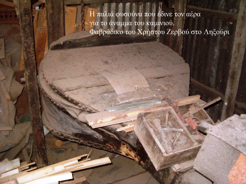 Σε μια γωνιά του σιδηρουργείου του υπάρχει ακόμη στημένο το καμίνι με τη μεγάλη φυσούνα ή το φυσερό όπως το λέει, κληρονομιά από το παλιό σιδηρουργείο του Καλαμούρη. Ζέσταινε το σίδερο στο καμίνι, που έκαιγε με τη βοήθεια του κάρβουνου, συντηρώντας τη φωτιά με το φυσερό και όταν κοκκίνιζε το σίδερο το έπαιρνε με τη τσιμπίδα και το έβαζε πάνω στο αμόνι, όπου άρχιζε να το σφυρηλατεί.