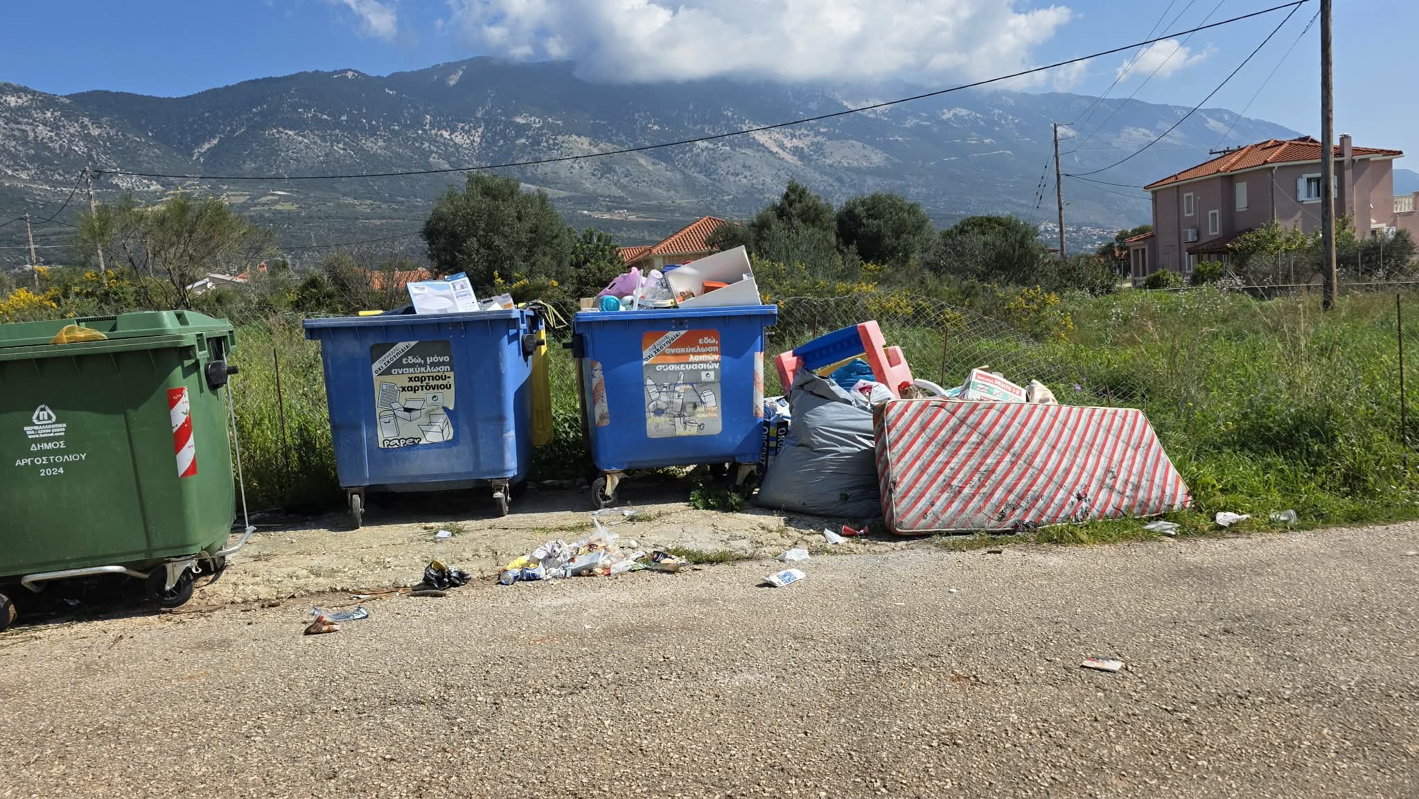 Ανακυκλώσιμα υλικά στους κάδους για τα σκουπίδια και σκουπίδια στους κάδους για τα ανακυκλώσιμα. Και γύρω-γύρω ένα σωρό άχρηστα αντικείμενα συμπληρώνουν τον πίνακα της ντροπής!