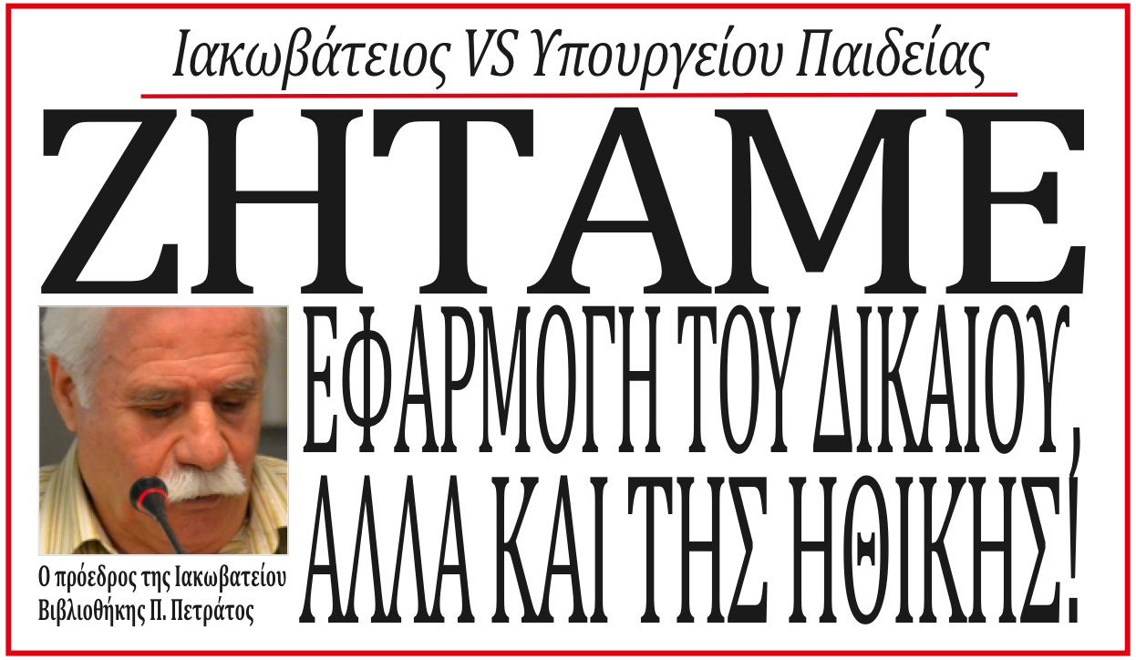 Για άλλη μια φορά το Υπουργείο Παιδείας με τις συγκεκριμένες αποφάσεις του δημιουργεί προβλήματα στη λειτουργία της Ιακωβατείου Βιβλιοθήκης. Λες και δεν το ενδιαφέρει η εύρυθμη λειτουργία της Βιβλιοθήκης και κατεπέκταση η παιδεία και ο πολιτισμός του Τόπου μας, λες και δε σέβεται το ρόλο του Εφορευτικού Συμβουλίου της Βιβλιοθήκης και κατά συνέπεια υποτιμά τις γνωμοδοτήσεις και τις προτάσεις του, λες και δεν υπάρχουν πολίτες στο Ληξούρι και στην Κεφαλονιά που θέλουν και επιδιώκουν να έχουν και να χαίρονται μια σωστά λειτουργούσα Βιβλιοθήκη.
