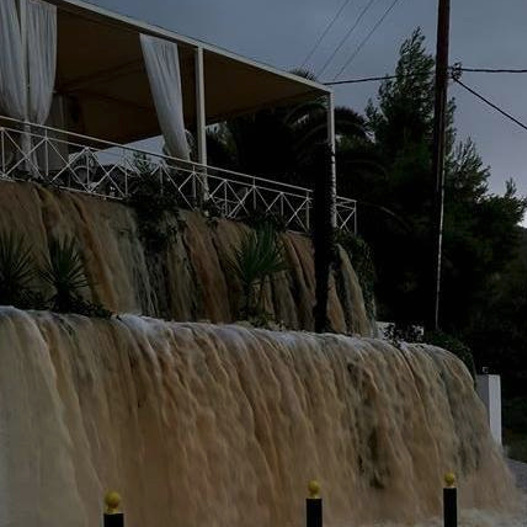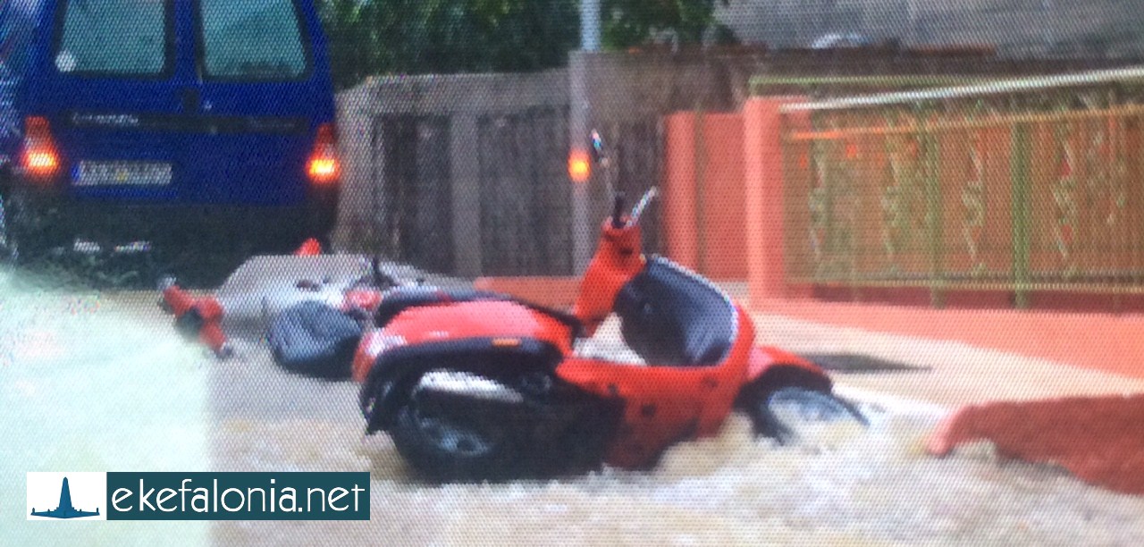 Η δυνατή νεροποντή στην Κεφαλονιά, που ξεκίνησε στις τρεις το μεσημέρι, κατάφερε μέσα σε λίγα λεπτά να μετατρέψει τους δρόμους σε ορμητικά ποτάμια που παρέσυραν στο διάβα τους αυτοκίνητα, τραπέζια, καρέκλες και ό,τι άλλο έβρισκαν μπροστά τους.