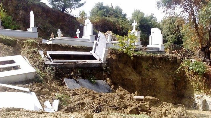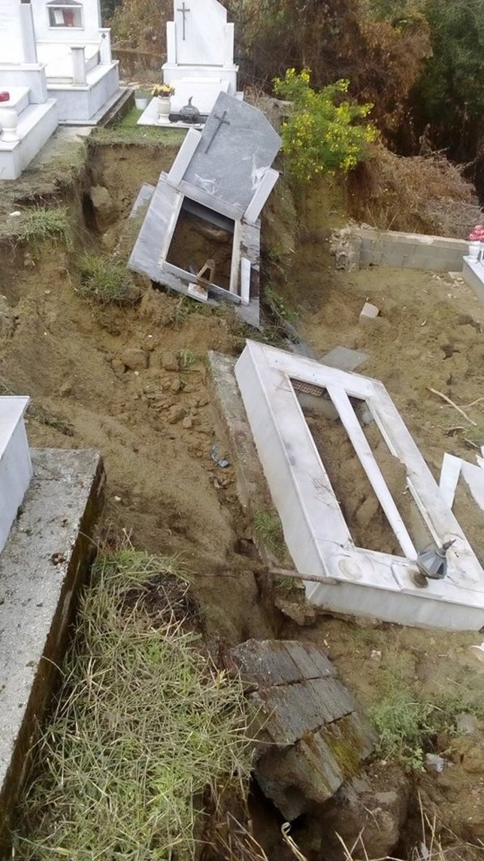 Το οδόστρωμα σε περιφερειακό δρόμο υποχώρησε, ενώ το νεκροταφείο του Αγίου Δημητρίου παρουσίαζε μακάβρια εικόνα αφού πέντε τάφοι άνοιξαν και μετατοπίστηκαν.